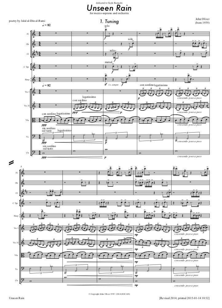 I composed these eight miniatures expressly for Judith Forst and the CBC Radio Orchestra in 1995. June Goldsmith, Artistic director of Music in the Morning, co-commissioned  Unseen Rain with the CBC Radio Orchestra. In the early stages, as we discussed ideas, June suggested I read any writings by the Sufi poet Jalal al-Din al-Rumi. Rumi was a prolific writer, whose meeting, at age 37, with a great mystic, Shams, elicited a pouring forth of improvised quatrains about love and true friendship. The quatrains come off the page in English translation as imagist poems, like little diary entries. This was a great discovery for me and timely, too. My new interest in concise forms found its match in the quatrains. Over the years I have been interested in exploring the art song form in a context that includes the music of the World. So whereas one might hear a spiritual debt owed to Schubert, the musical language takes in Bartok, Berg and Persian folk song as well. John Moyne and Coleman Barks, the translators of the Rumi quatrains I used, remarked that in the original Sufi, they are "sonically very dense, with clusters of similar or identical sounds piled quickly one upon the other." The translators were not able to retain this characteristic, partly because of their intention "to connect these poems with a strong American line of freeverse spiritual poetry." I this spirit, I have created an accompaniment that sees a piling-up of sounds, but one that also creates a sense of sudden mystery and clarity.