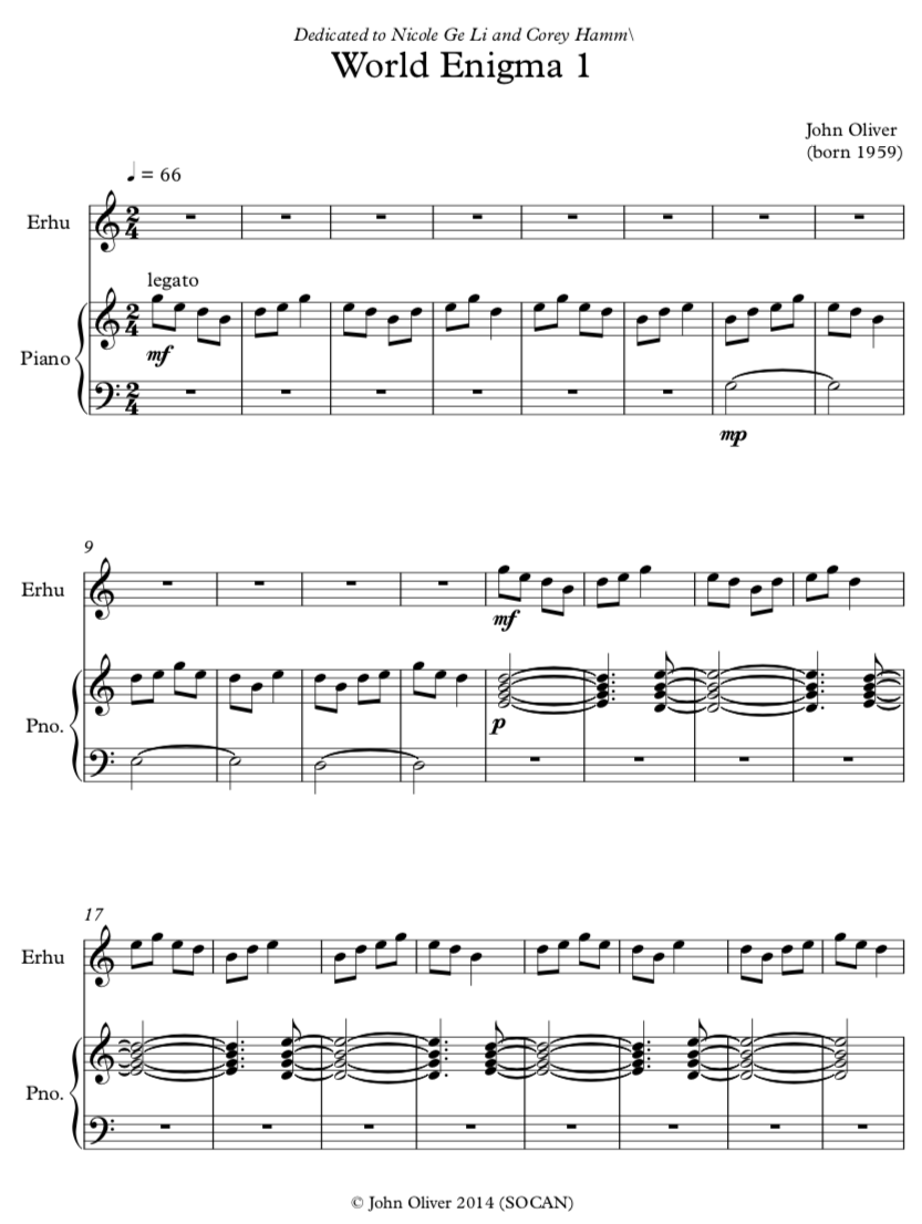 In World Enigma 1, I begin a new series of simple music in which I do not use any software for the creation or organization of the music. Working with only the five traditional pitches used in most Chinese music, I create musical phrases that move in particular ways that suggest their Chinese origin, yet remain unresolved in either the Asian or Western sense. Due to this ambiguity, the music also begs to be transcribed for different small chamber groups. There are two versions available: the original version for erhu and piano, and a second version for xun/dizi, guzheng, and harp.