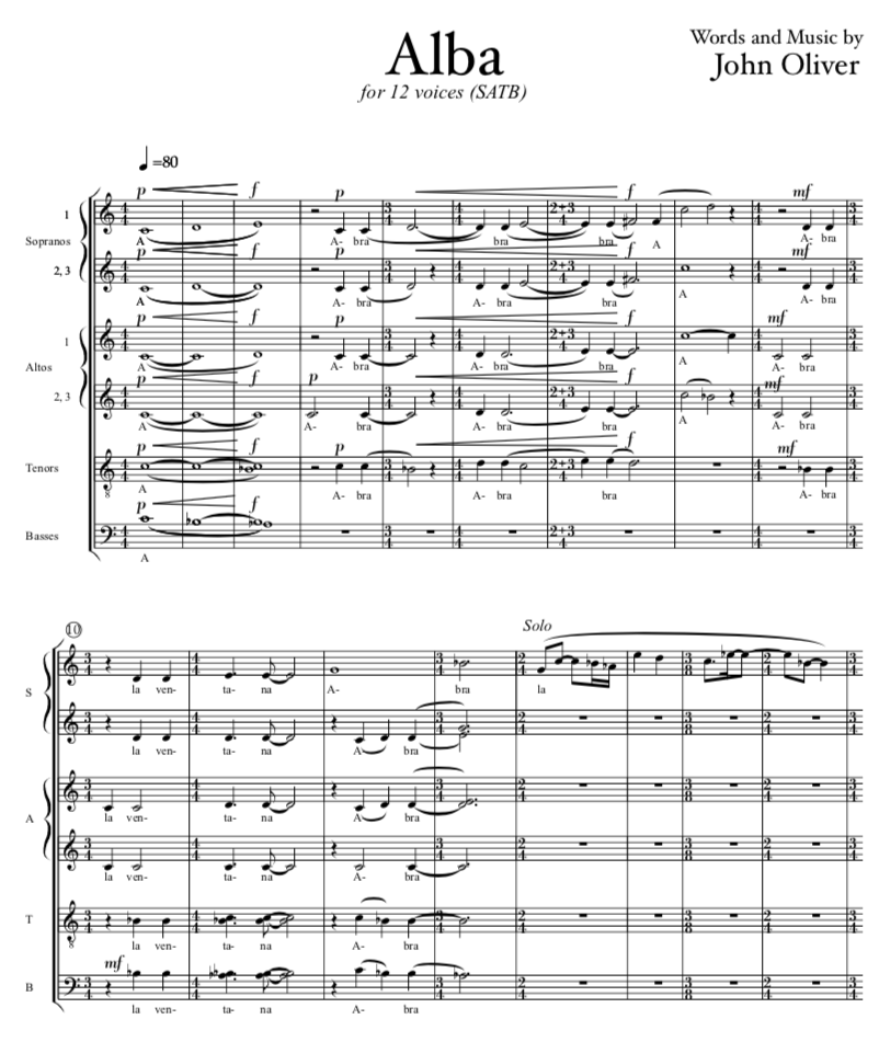 I wrote the text in Spanish first, then translated it into English. In the repertoire of the troubadours and trovères, the alba is a song that deals with the lover#s departure in the early morning. In the later German minnesinger tradition, these often became devotional prayers. I have combined the two in my piece, transforming the ecstasy of love that creates intense electricity between lovers in the first verse into the destructive $electricity% unleashed by the nuclear bomb in the second.
