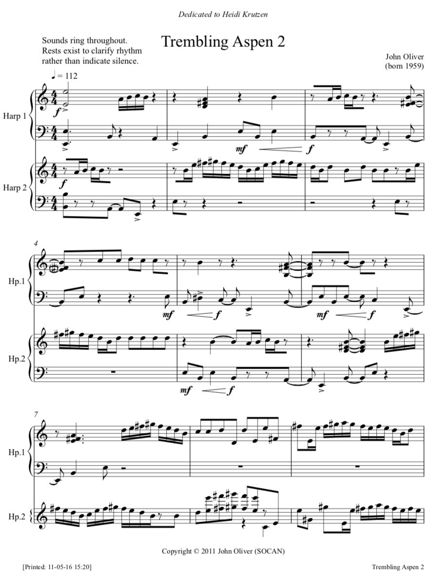 I wrote Trembling Aspen 2 for two harps in the spring of 2011. I liken this ambient music, which is constantly active, to the experience of staring at a Trembling Aspen tree during a late-summer breeze. A description of the tree is as good as a description of how I created the piece: "A slender, graceful tree with smooth, greenish-white bark; grows up to 25 metres tall; distinctive leaves that quiver in the slightest breeze. It is known for its ability to sprout from root suckers and form clones of many individual stems. Aspen clones can often be distinguished in spring or fall when groups of stems leaf out or change colour all at once. These clones can get quite large and can be very long-lived. Some are estimated to be over 5,000 years old." And,"The trembling aspen would make an interesting Shakespearean character. There are not many trees in the world you can find with your ears, that can live on for centuries or that make imperceptible connections underground. The tinkling of leaves, like a soft wind chime, can be heard from east to west, one of those familiar pieces of natural Canadiana."