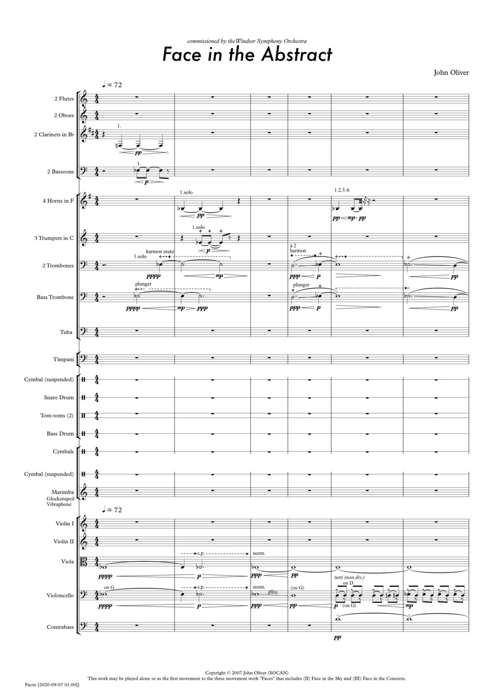 FACES consists of three movements that may be played individually, or as a three-movement symphony. The idea for the "Faces" symphony came to me as the result of a commission from the Windsor Symphony in 2006 for a composition inspired by the visual arts. I was particularly interested in the phenomenon of seeing faces in our environment: in the surfaces of trees and stones, the clouds, the earth. The overall idea that unifies all of the pieces is a desire to create music that is at once familiar but fresh, that summons up various images for each listener, and that creates a new, visceral listening experience.