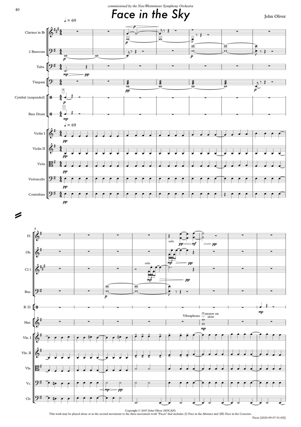 "Face in the Sky" and "Face in the Concrete" were commissioned by the New Westminster Symphony Orchestra and were premiered by the orchestra, conducted by Jin Jhang, on March 4, 2007 at Massey Theatre in New Westminster, BC, Canada.